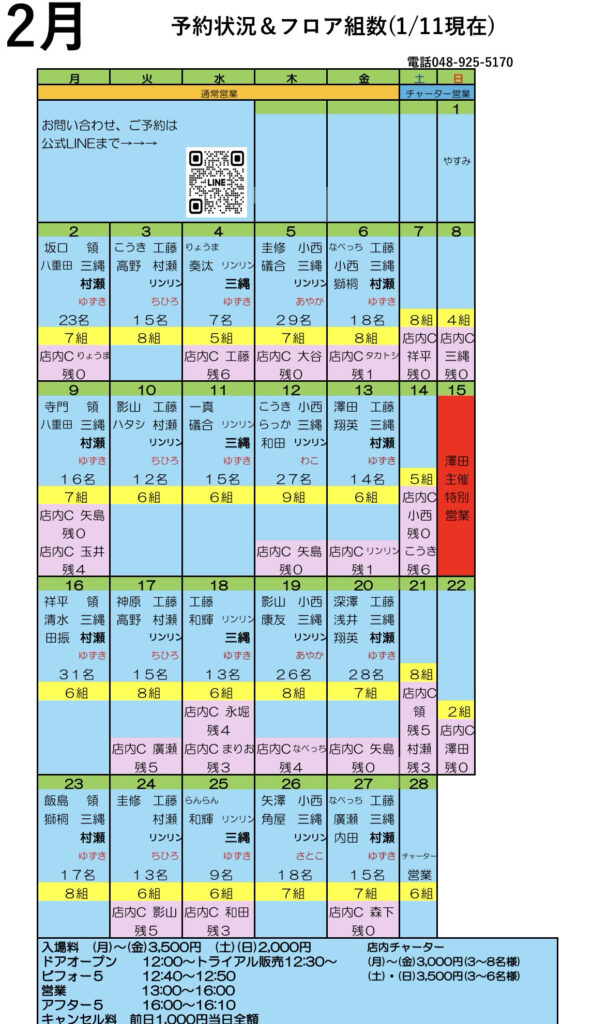 2月の予約状況(1/11現在)