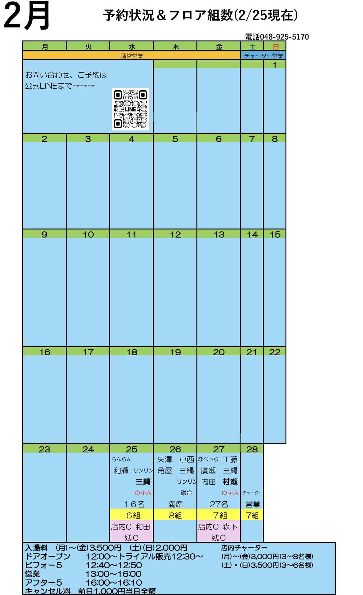 2月の予約状況(2/25現在)