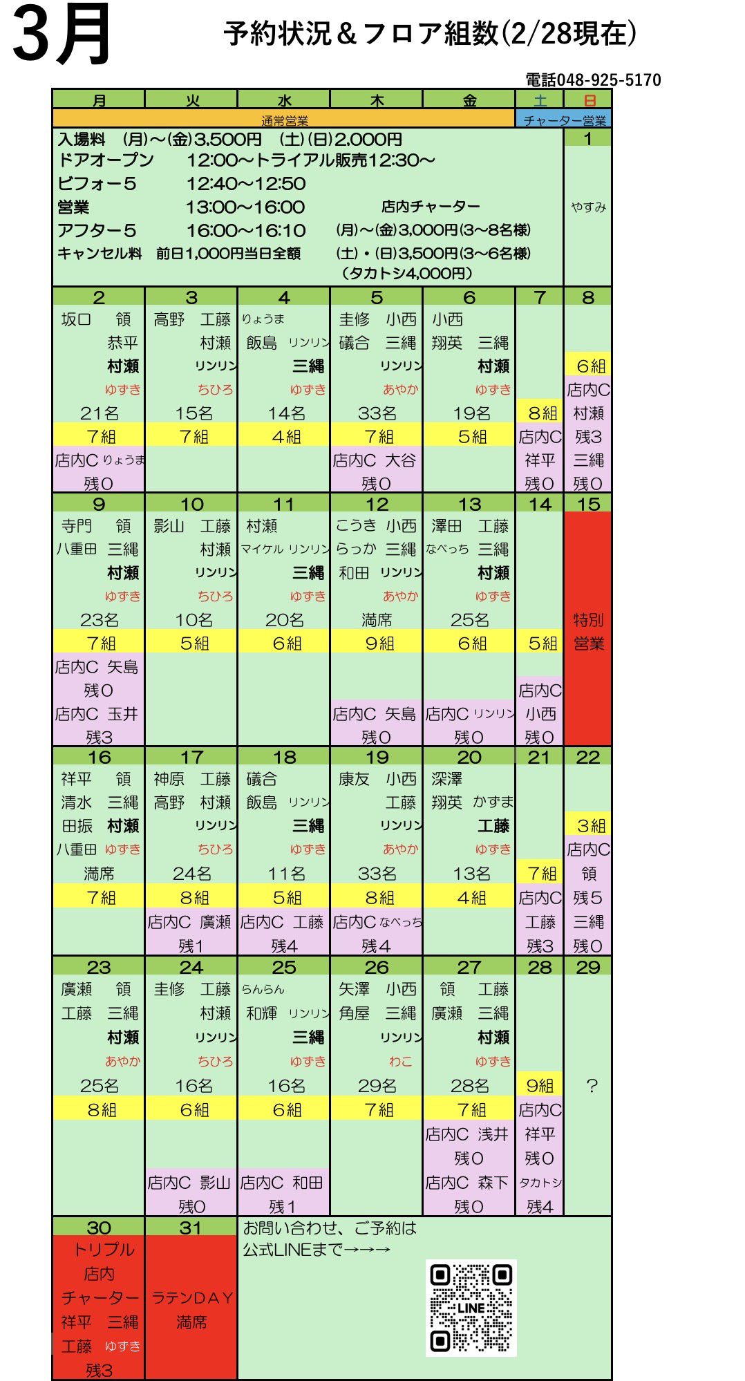 3月の予約状況(2/28現在)